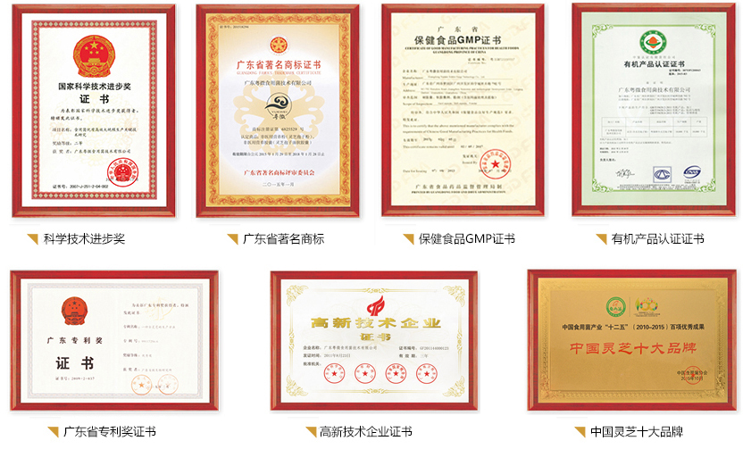 ○2008年:“全灵芝孢子粉”荣获广东省高新技术产品证书